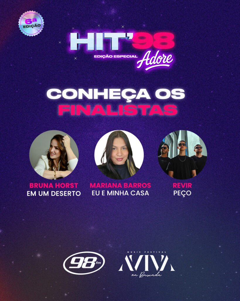Nesta sexta-feira (28) a Rádio 98FM anunciou oficialmente os três finalistas da 6ª edição do Hit 98 – Especial Adore, concurso musical que destaca novos talentos da música cristã. A seleção reuniu diversas composições autorais e, após avaliação, três projetos se destacaram e avançaram para a grande final.