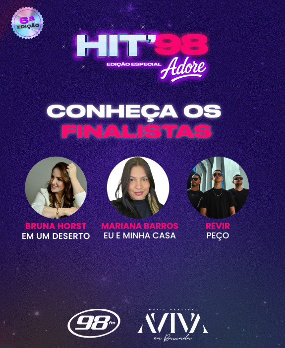 Chegou a hora de descobrir quem sobe ao palco do Aviva na Baixada como o grande vencedor do HIT 98FM. A final acontece neste sábado, dia 6, e reúne três artistas que conquistaram o público ao longo de semanas de votação: Bruna Horst, com Em Um Deserto, Mariana Barros, com Eu e Minha Casa, e a banda Revir, com Peço.